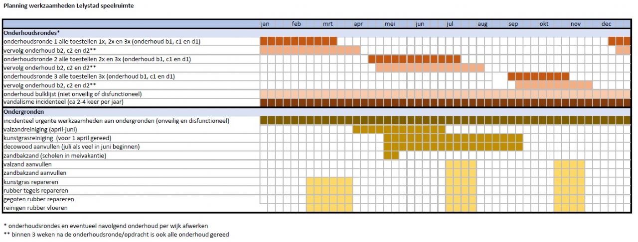 De door OBB voorgesteld aanpak is als volgt. Er wordt een inventarisatie gemaakt van de inspectiefrequentie van individuele toestellen en specifieke speelplekken. Standaard gebeurt dat één à twee keer per jaar, twee keer op plaatsen met toestellen die bijvoorbeeld relatief snel zouden kunnen slijten of rotten, en drie keer bij speelplekken met echt risicovolle toestellen (denk aan oude en hoge draaitoestellen, natuurspeelplekken, plaatsen waar veel vandalisme is en schoolpleinen). De meest intensief gebruikte plaatsen (zoals speelpleinen bij scholen) kunnen vier keer per jaar gecontroleerd worden. Aan de hand hiervan wordt een jaarkalender gemaakt (zie figuur 2).