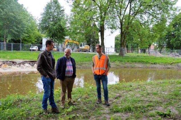 Johan Wessel (gemeente Assen), Bart Veldman en Jan-Bouke Sijtsma (beiden Boom-KCB) staan op het GGZ-terrein in Assen. Door het herstellen van onder andere de oude beeklopen wil de gemeente een aantrekkelijke omgeving creƫren voor haar inwoners en toeristen. De loop van de Nijlandsloop op het terrein van GGZ Drenthe was als een van de laatste aan de beurt.