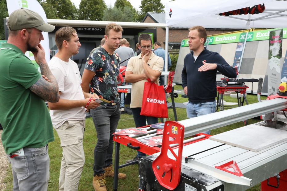 | Pret bij Redsun. Redsun zette de dag volledig in op de promotie van Cerasun, een tegel met een vaste verbinding van keramiek en beton. De tegels combineren een slijtvaste keramische toplaag met een sterk verdichte betonkern. |